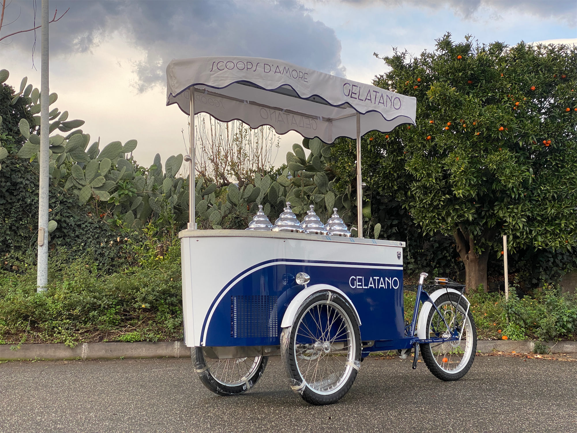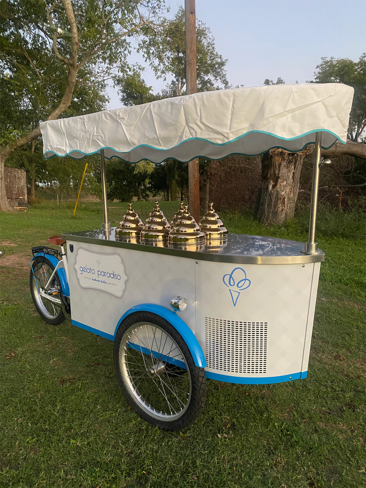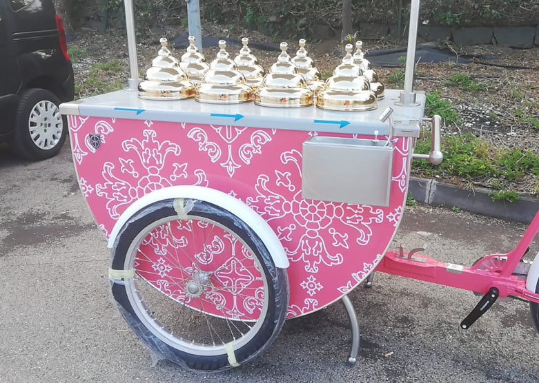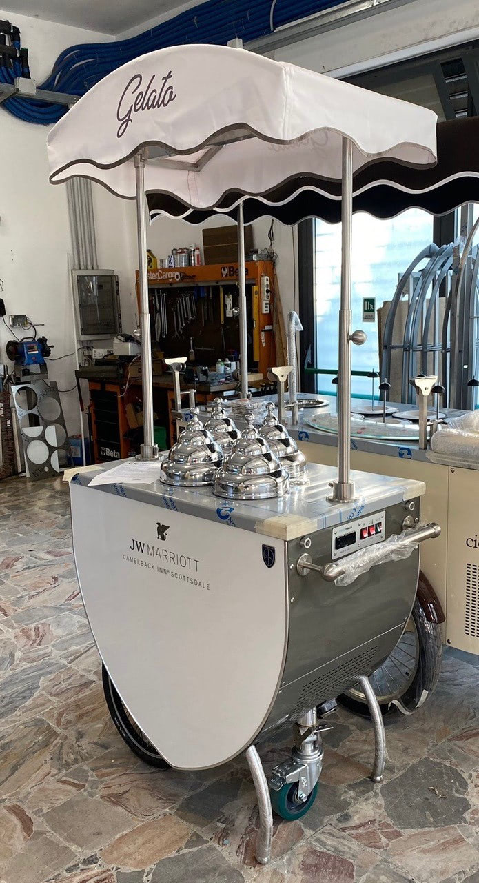 Mobile Gelato Carts add an elegant and delicious touch to catering events and suitable to take your product outside. The beautifully decorated and highly visible gelato cart is designed to market your product at outside events, farmers markets, weddings, birthday parties, and more. allowing guests to choose or mix and match their favorite flavors. What better way to authentically serve up gelato and impress your guests or customers?Our design team is able to provide you with drawings for a custom Pozzetti style gelato cart built especially for your needs. Carts are a great way to take your product outside your store or beautify your store’s inside! The customized cart is authentic and eye-appealing. Emboss your logo, choose your cladding, add your umbrella, make it unique. We’ll walk you through the process.
